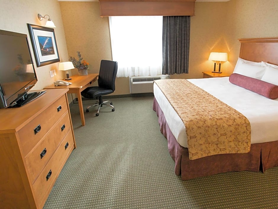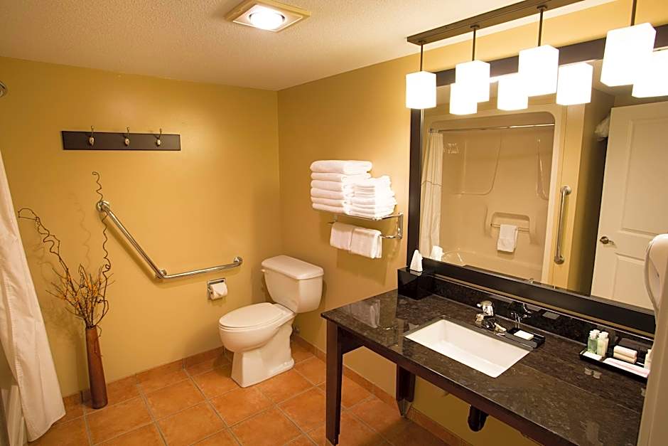 This wheel chair accessible room features a pillow top King bed and a queen sofa bed, and offers lowered switches, additional grab bars and a roll in shower in the bathroom.