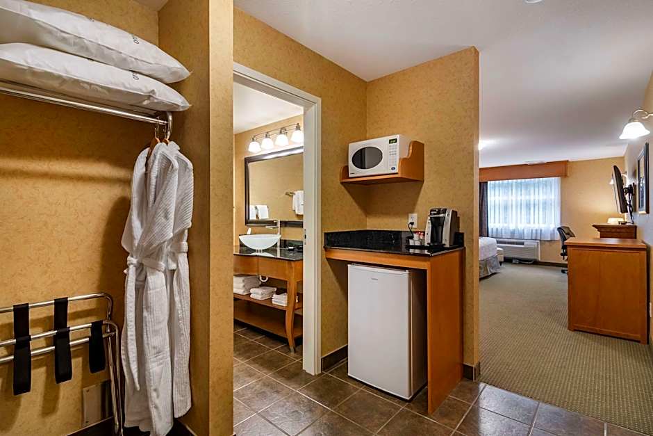 This spacious room offers a lounge chair, king pillow top mattress, fireplace, corner jetted tub, granite counters and luxurious bathroom complete with bathrobes.
