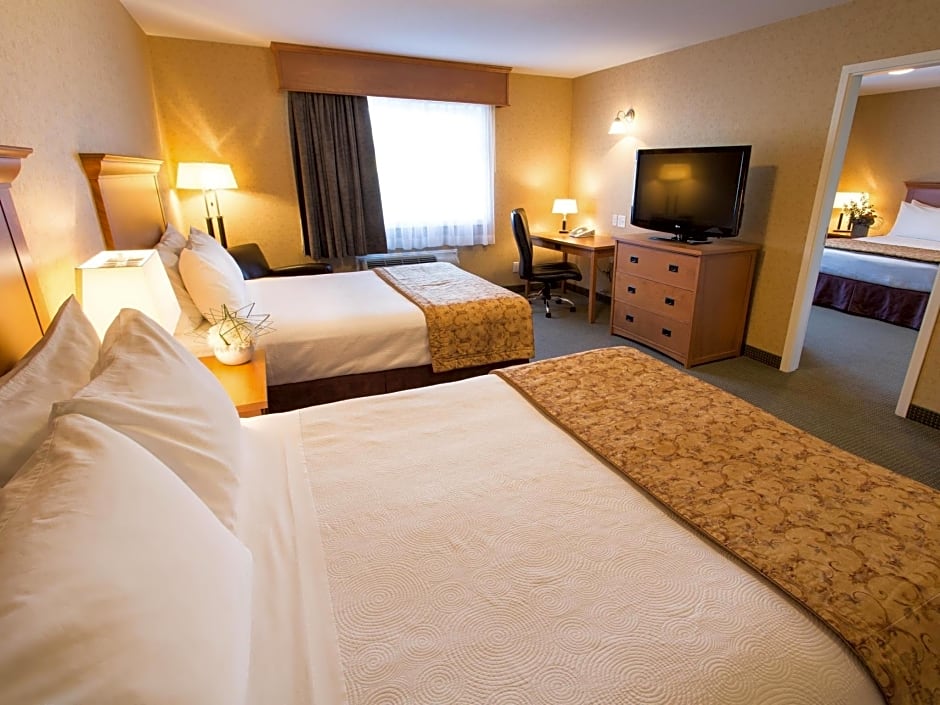 This deluxe family suite sleeps up to 6 guests with a separate bedroom featuring a queen bed and an additional 2 queen beds in the main room. This suite also features a large flat screen TV in each room this room, and a refrigerator, microwave, and coffee machine.